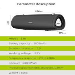 Brand: ZealotModel: S38Bluetooth Version: 5.0Speaker: 30WFrequency response: 100Hz-20kHzWorking Voltage: 7.4VWeight: 820Charging voltage:DC 5VTransmission distance= 10mSNR: GREATER THAN OR EQUAL 9dBDistortion: less then 1% Power Output: 20W